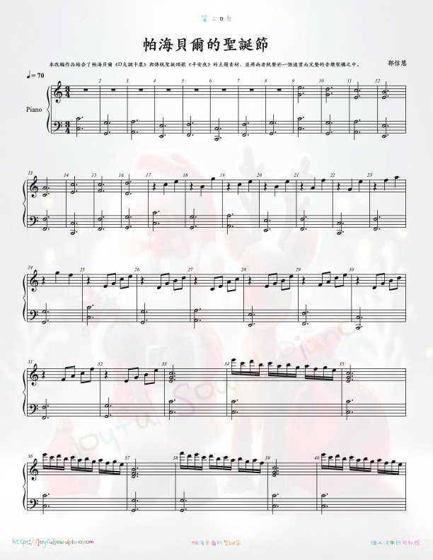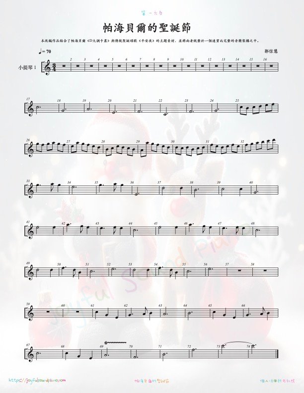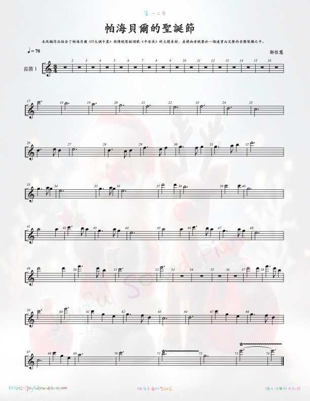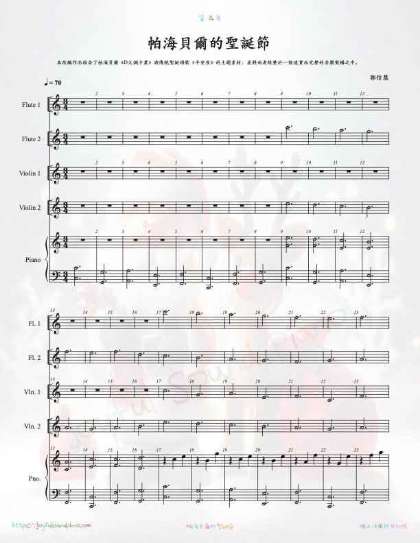 經典與聖誕交融:以《帕赫貝爾卡農》的標誌性結構開場,並完美過渡到《平安夜》。 適合小型合奏:為兩支長笛、兩把小提琴和鋼琴設計,創造出豐富而均衡的音色。 理想的節慶場合:無論是教堂、學校還是社區聚會,這首曲子都能激發喜悅與敬畏之情。
